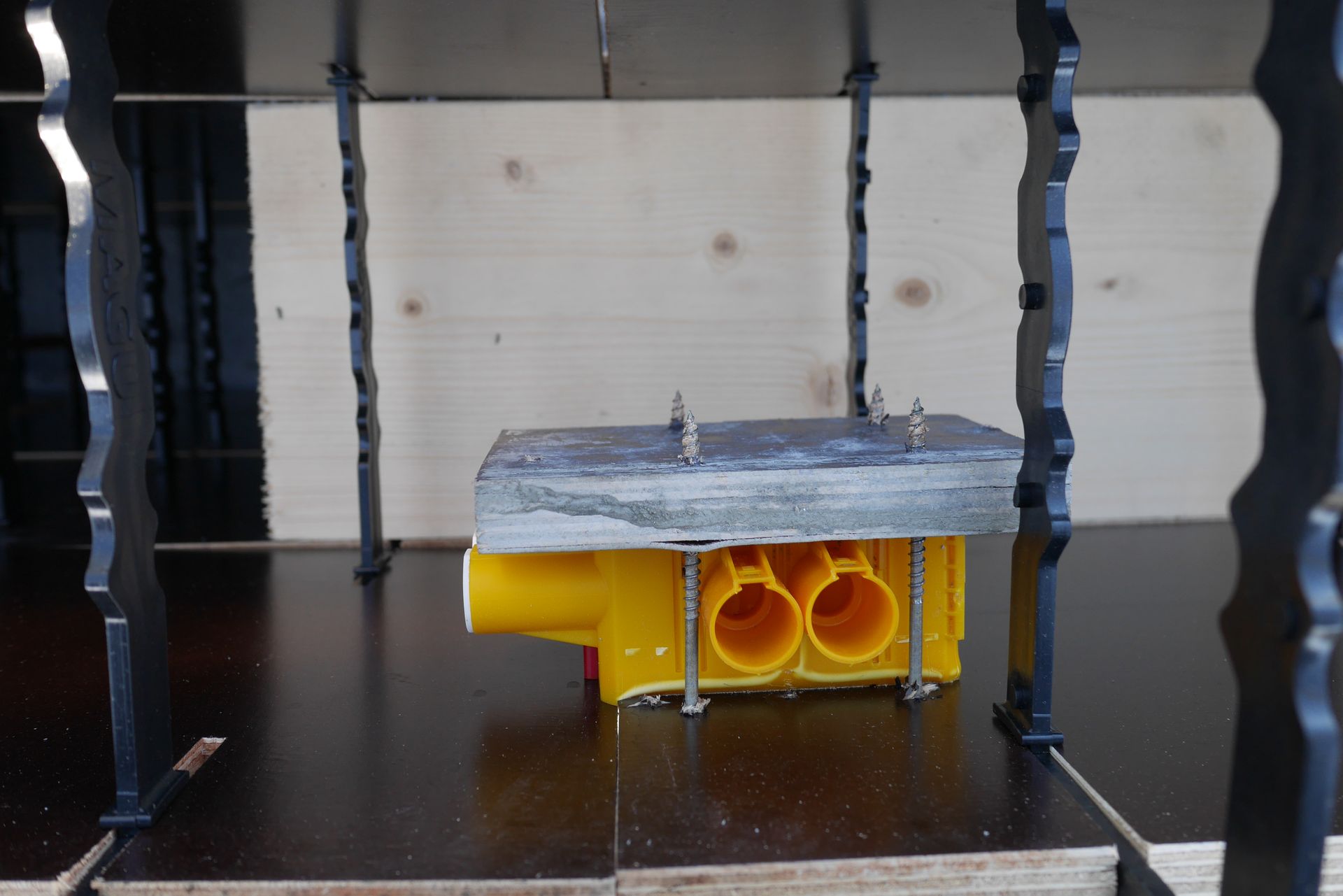- Dåserne kan fixeres med en plade på bagsiden, eller såfremt de står op med strips. To skruer i låget af dåsen er også med til at holde den på plads. Der må ikke skrues i bunden af selve dåsen.