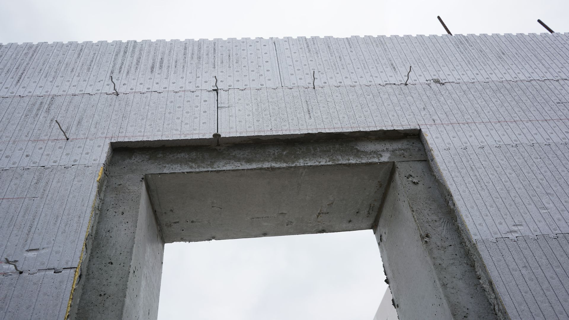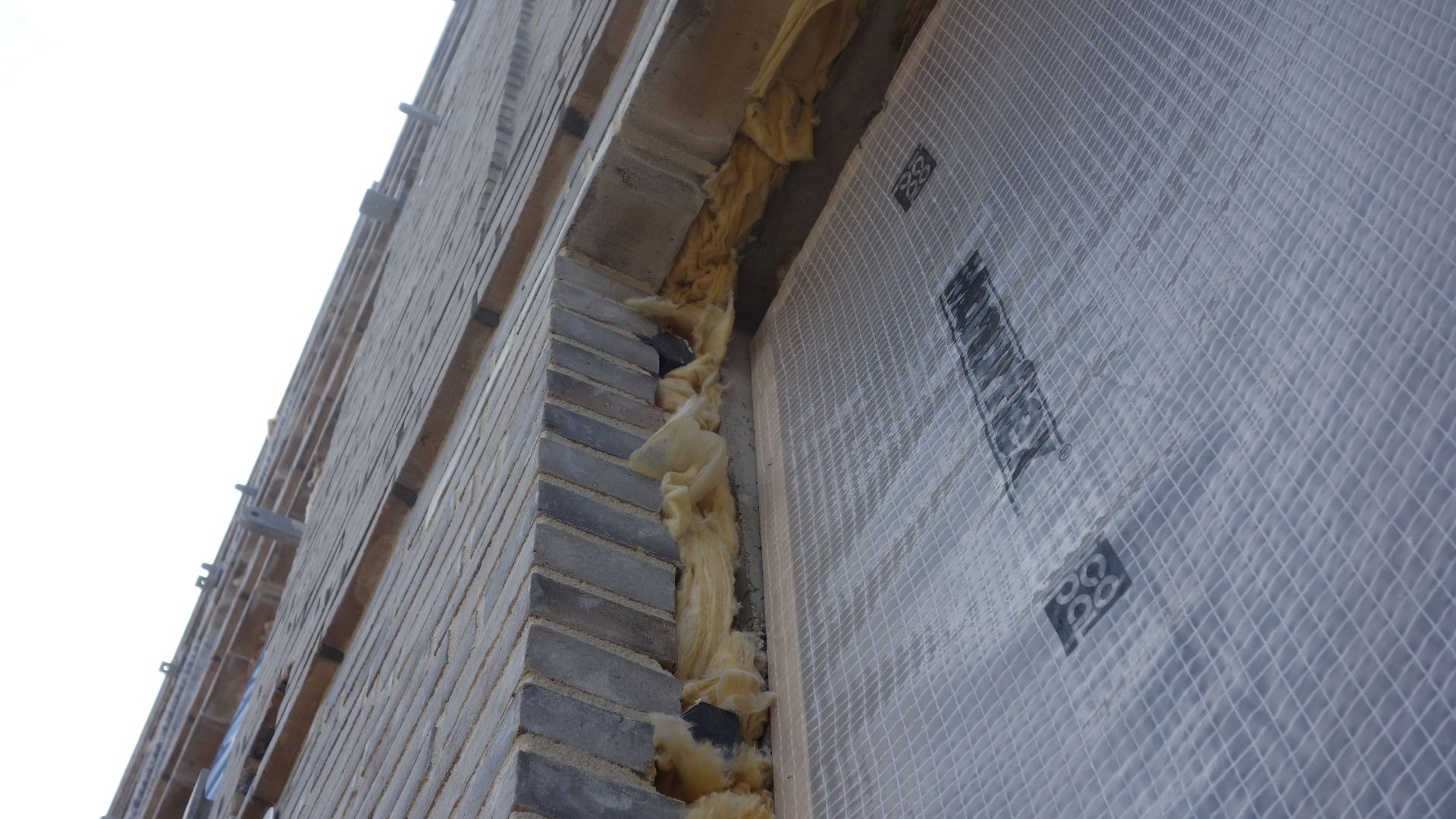 - Ved pudsede facader skæres væk i EPS blokken i siden, således at beonten lokalt flyder med u i vindueslysningen. (Billedet er set fra oven, hvor man ser ned i væggen oppe fra stillads)