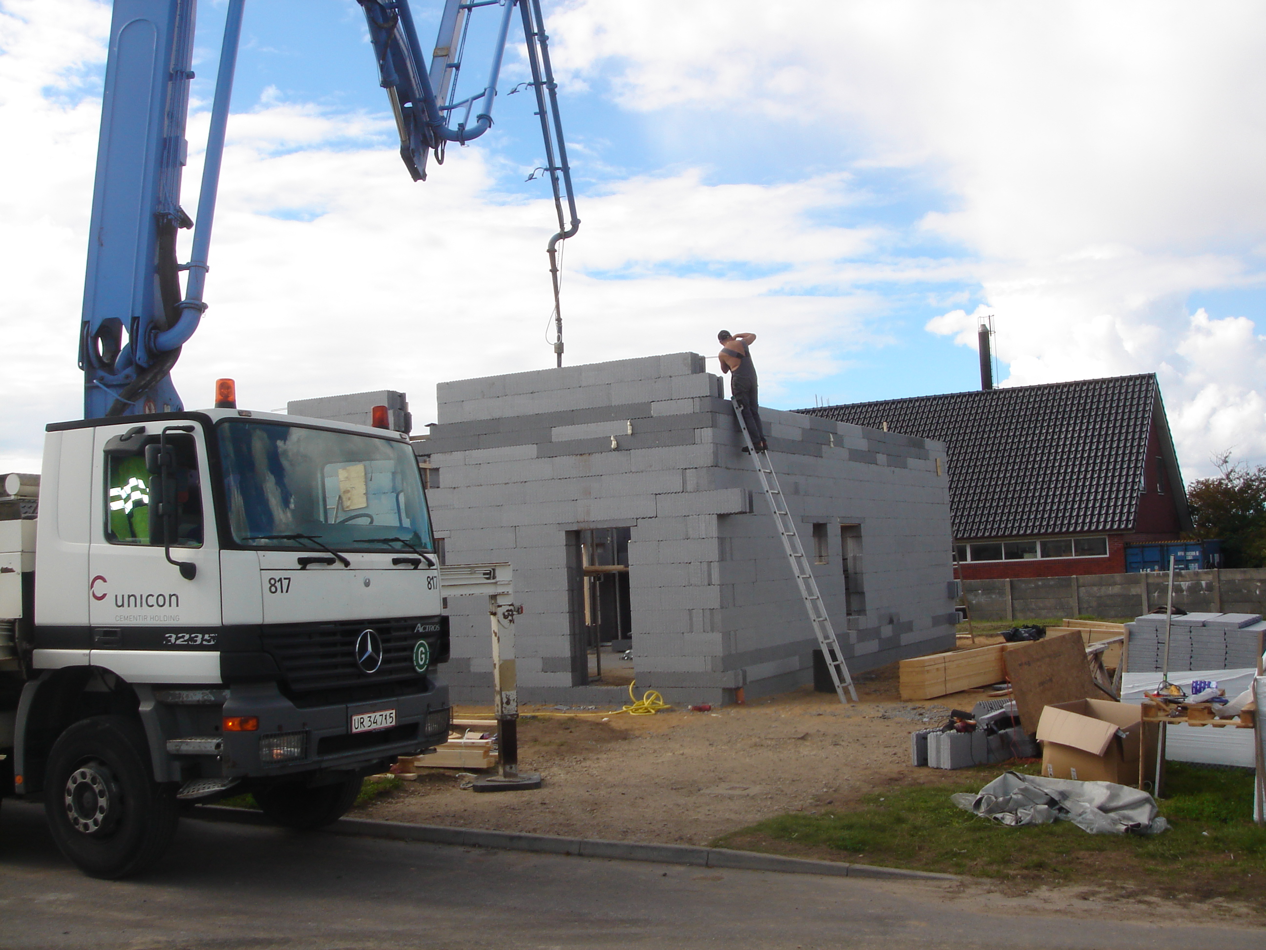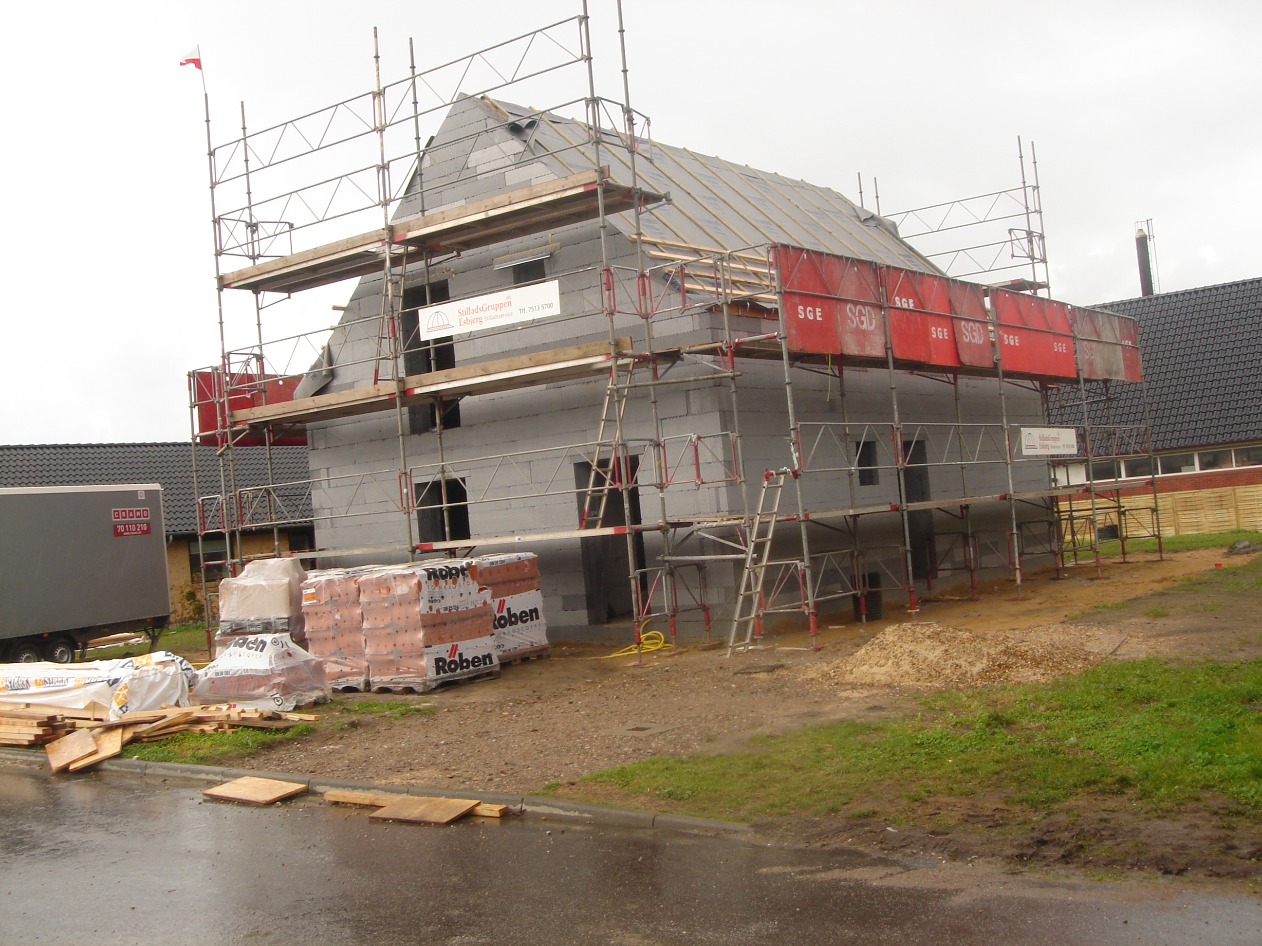Det har taget 3 mand 3 dage at rejse ydervægskonstruktionen ekskl. gavle. Hertil skal det nævnes at ydervæggene er 3,7 meter høje, da der efterfølgende skal ilægges en etageadskillelse.