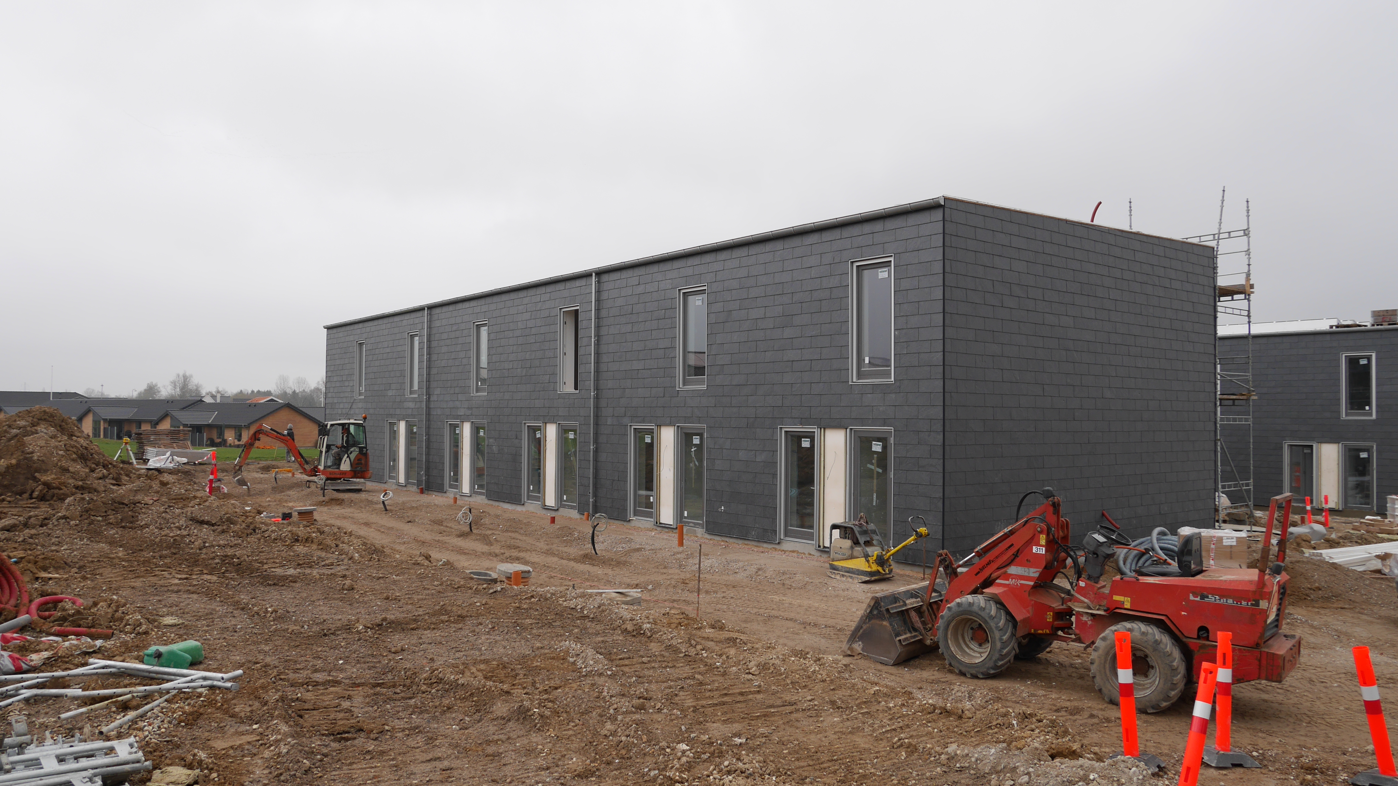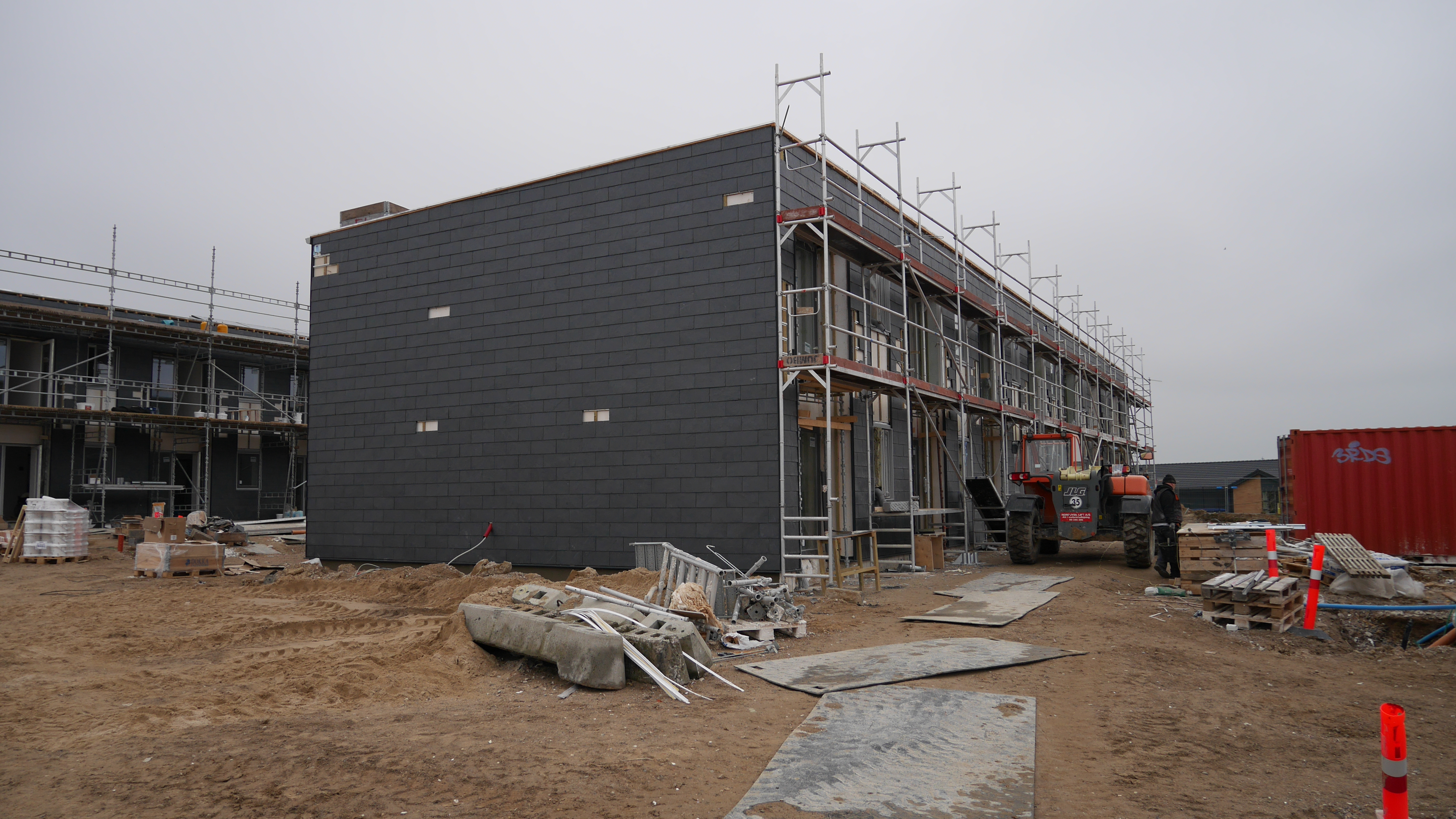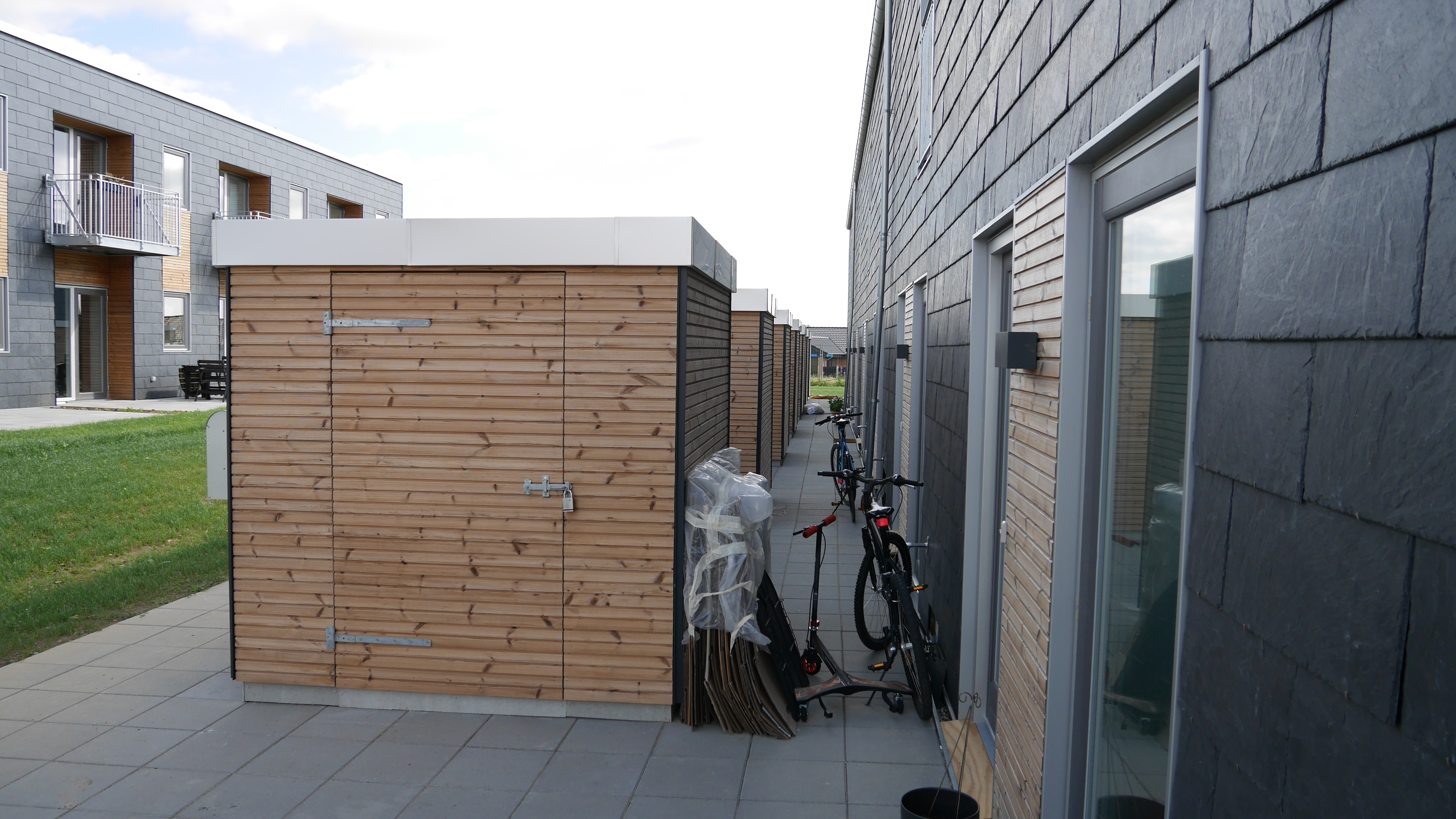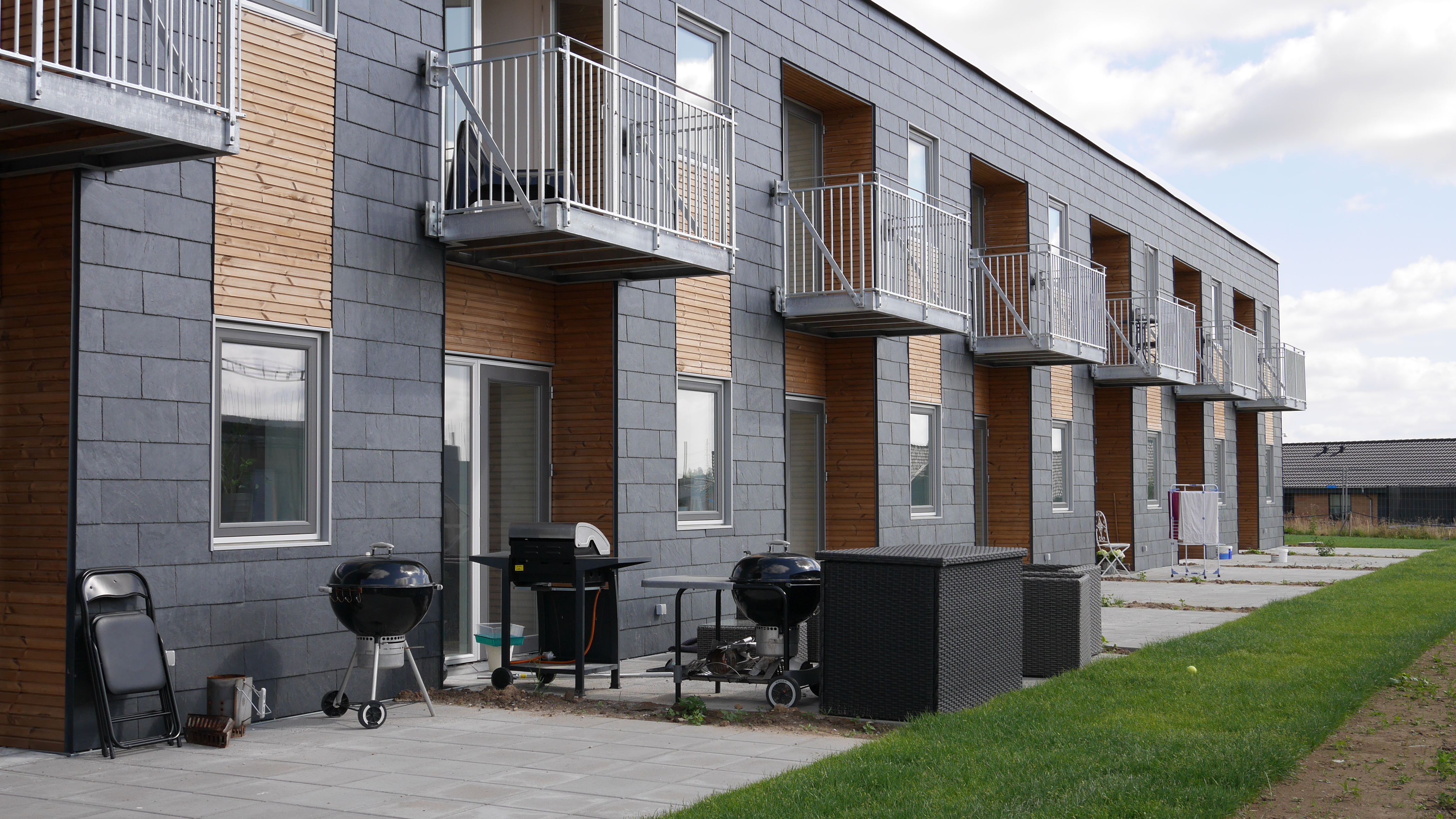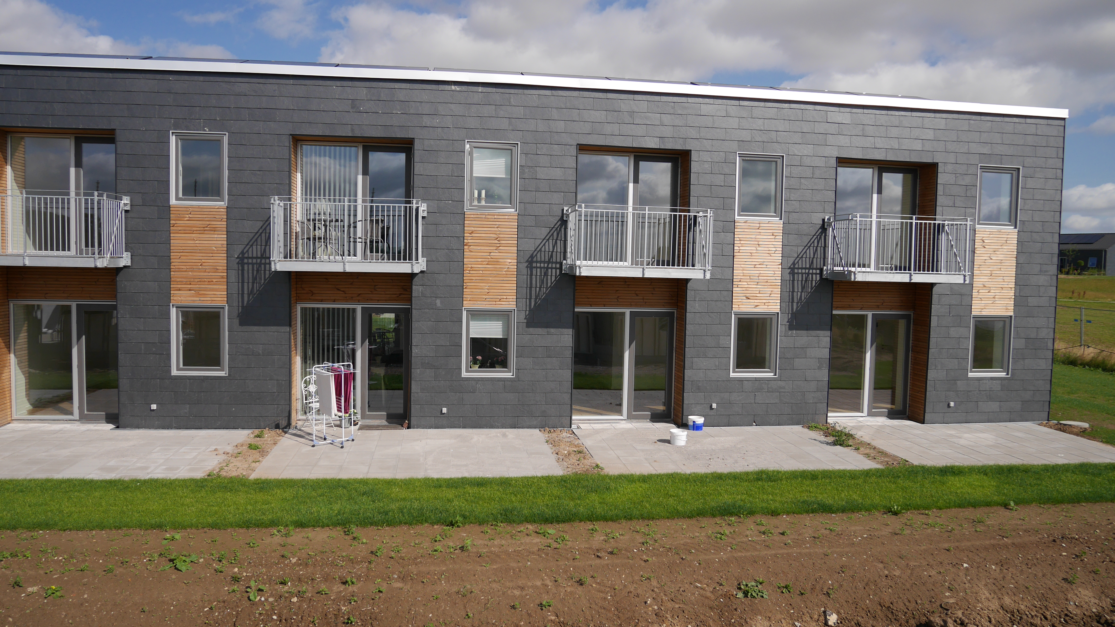- 2 etagers rækkehuse med skiffer og træ på facaderne