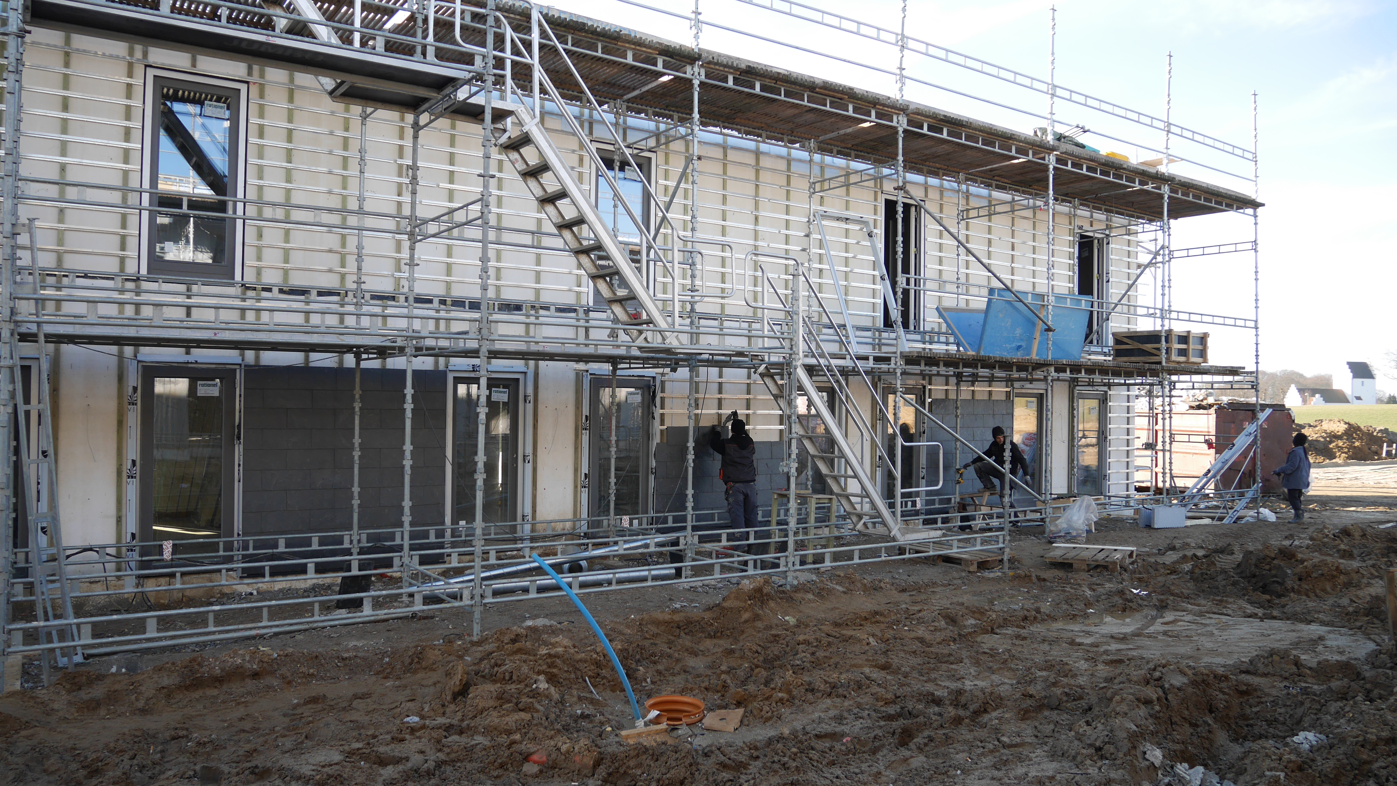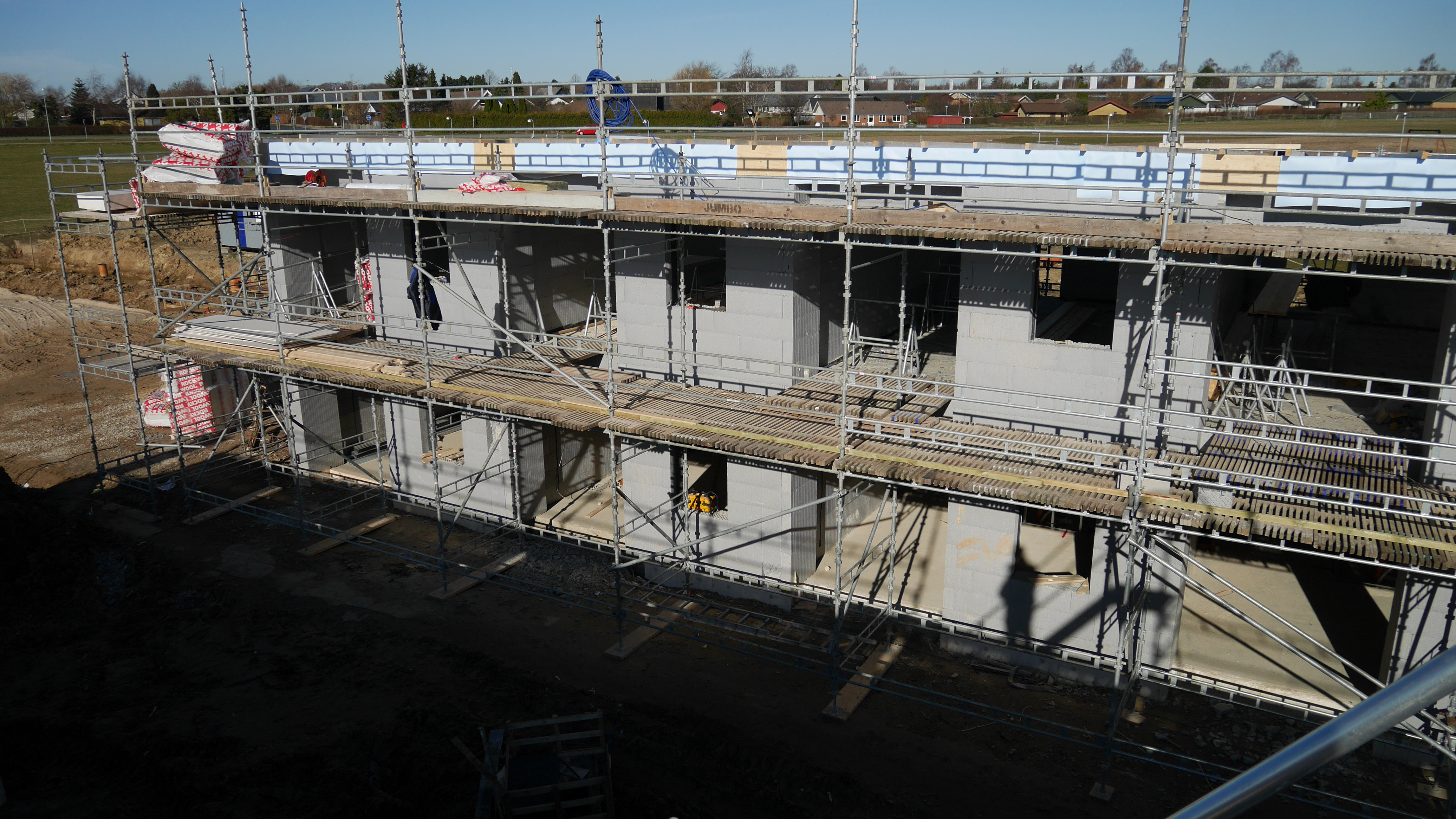 - De bolig adskillende vægge er ført helt ud til ydervæg. Og mellem hver bolig adskilles EPS med et bælte af Klasse A materailer, for at opfylde kravene i Eksempelsamling om brand vedr. adskillelse af 2 boliger.