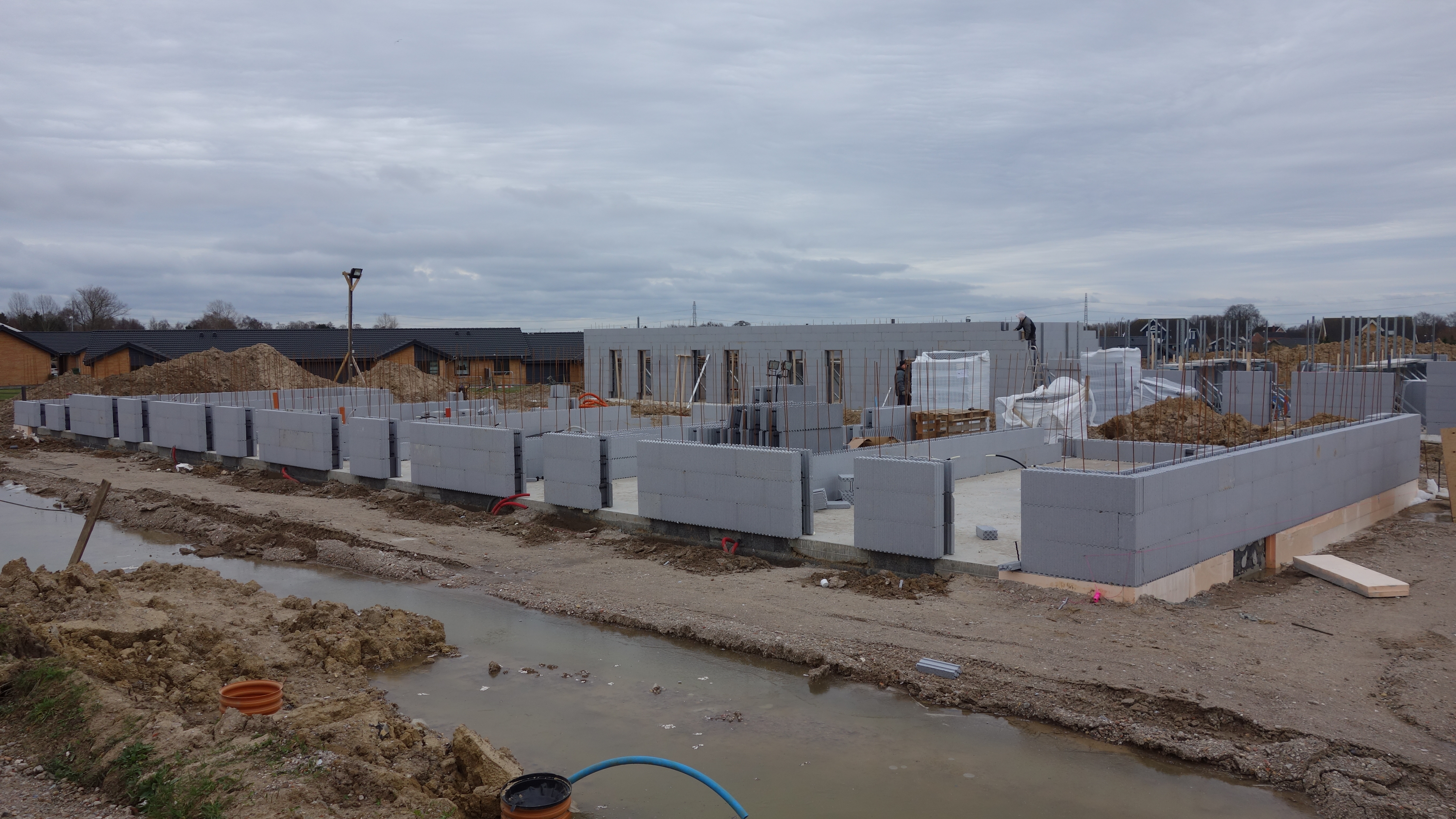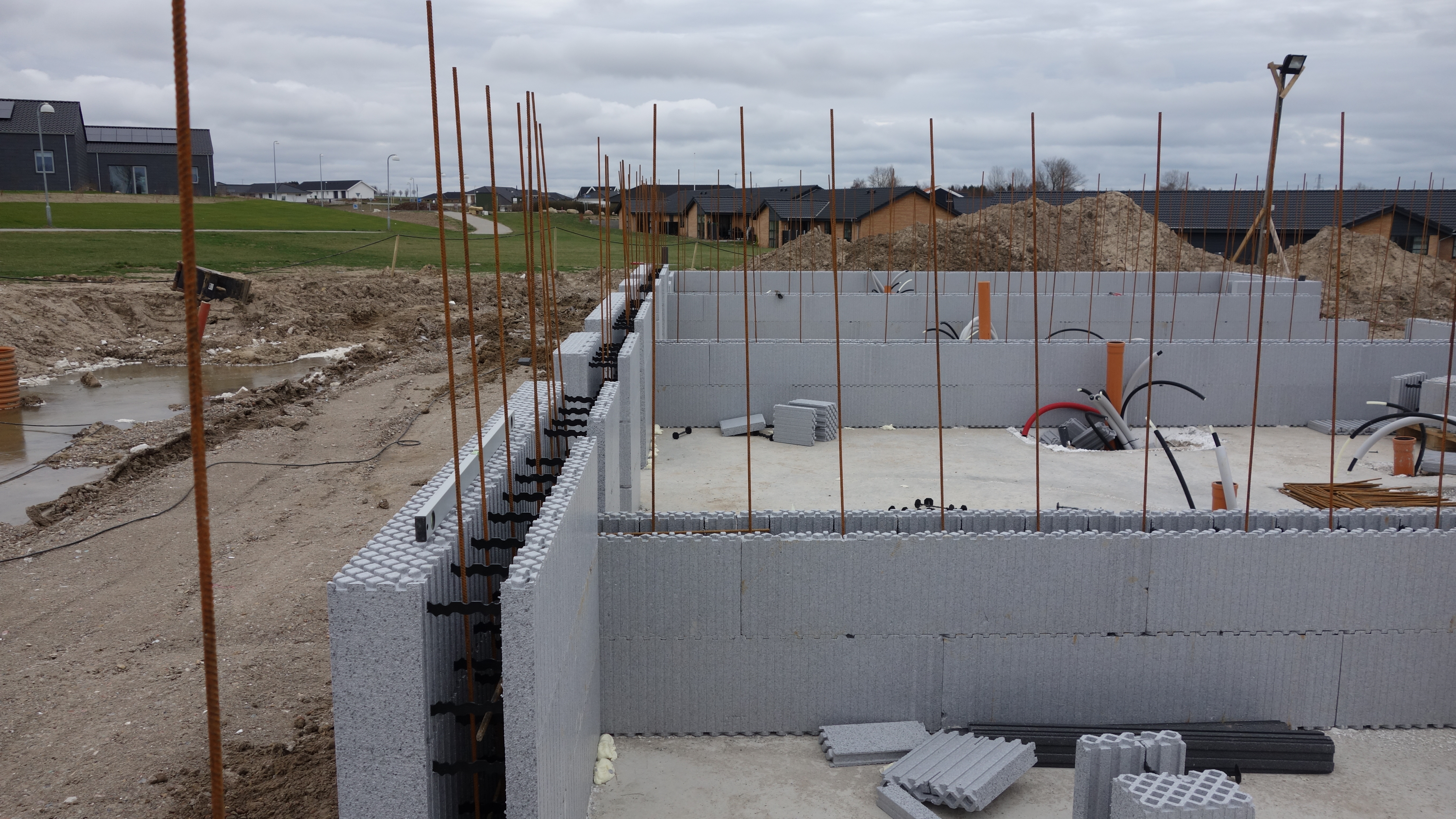 - Mellem boligerne benyttes ISOBYG 30 cm. blok med 19 cm. beton. Denne betontykkelse opfylder lydkravet mellem 2 boliger.