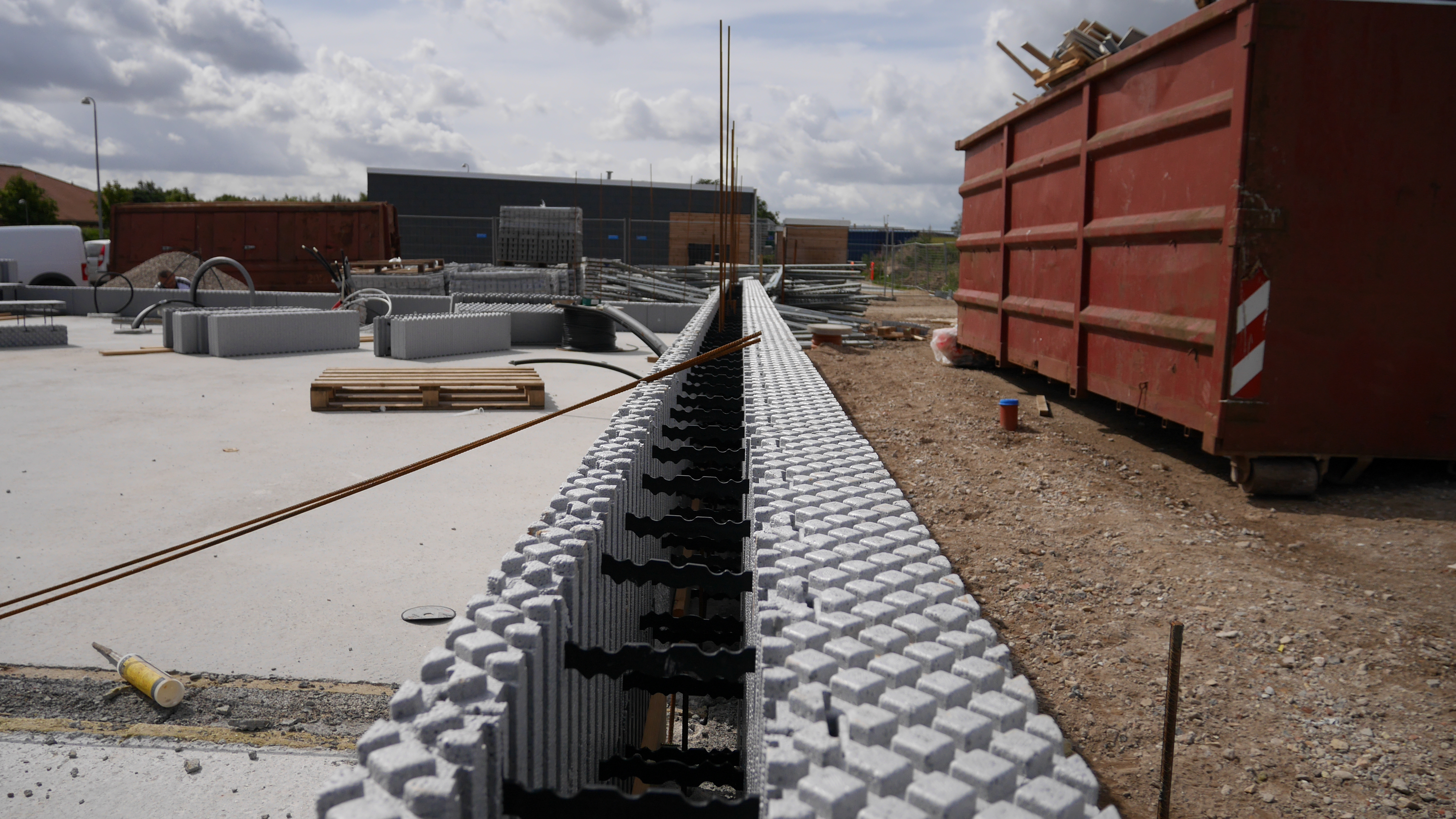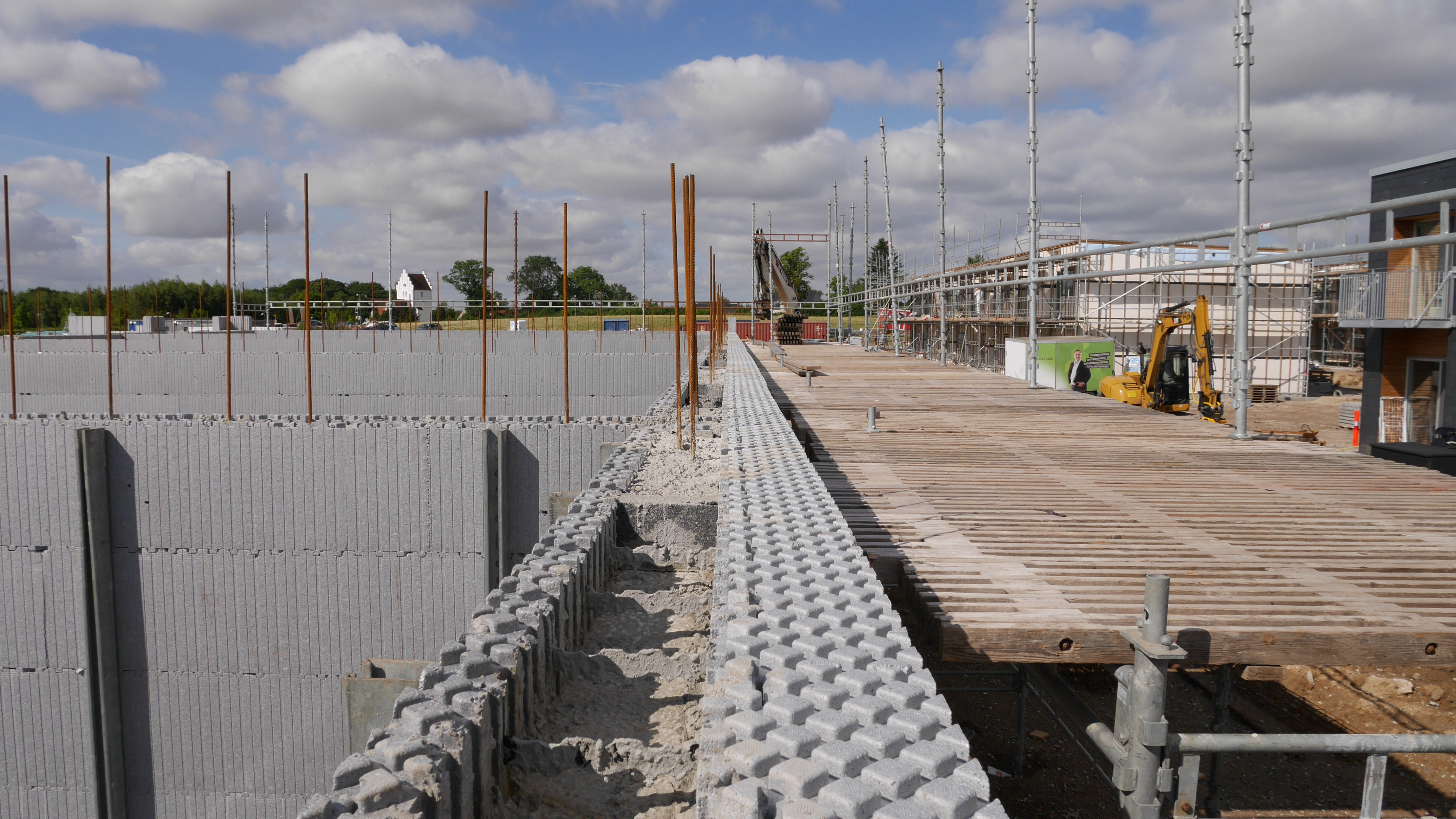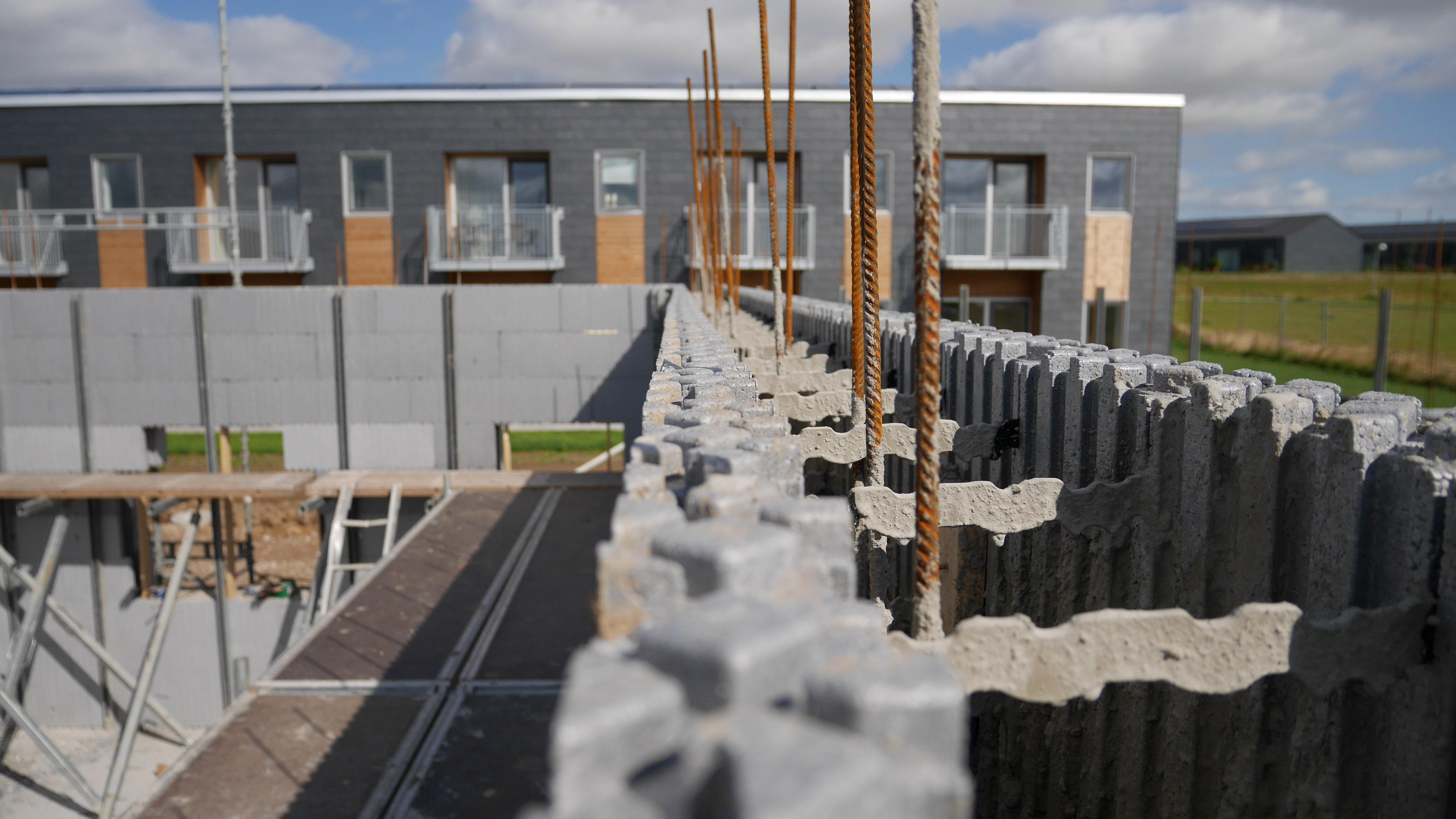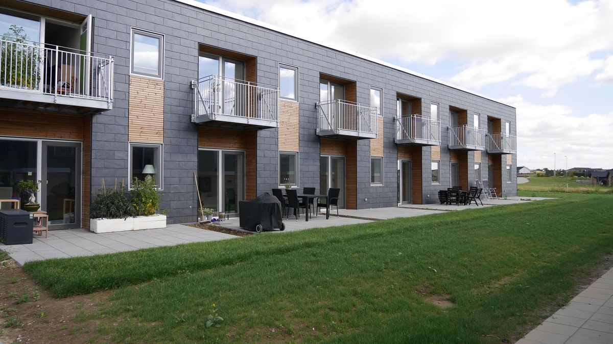 - Rækkehusene udnytter ISOBYG fleksibilitet, hvor der i ydervæggene er brugt 14 cm. beton, i skillevæggene er der brugt 19 cm. pga lydkrav, og i søjlerne ved terasseophæng er der brugt 24 cm. beton. Det fleksible system gør det nemt at tilpasse betontykkelsen, der hvor det statiske krav gør tykkere beton nødvendig.