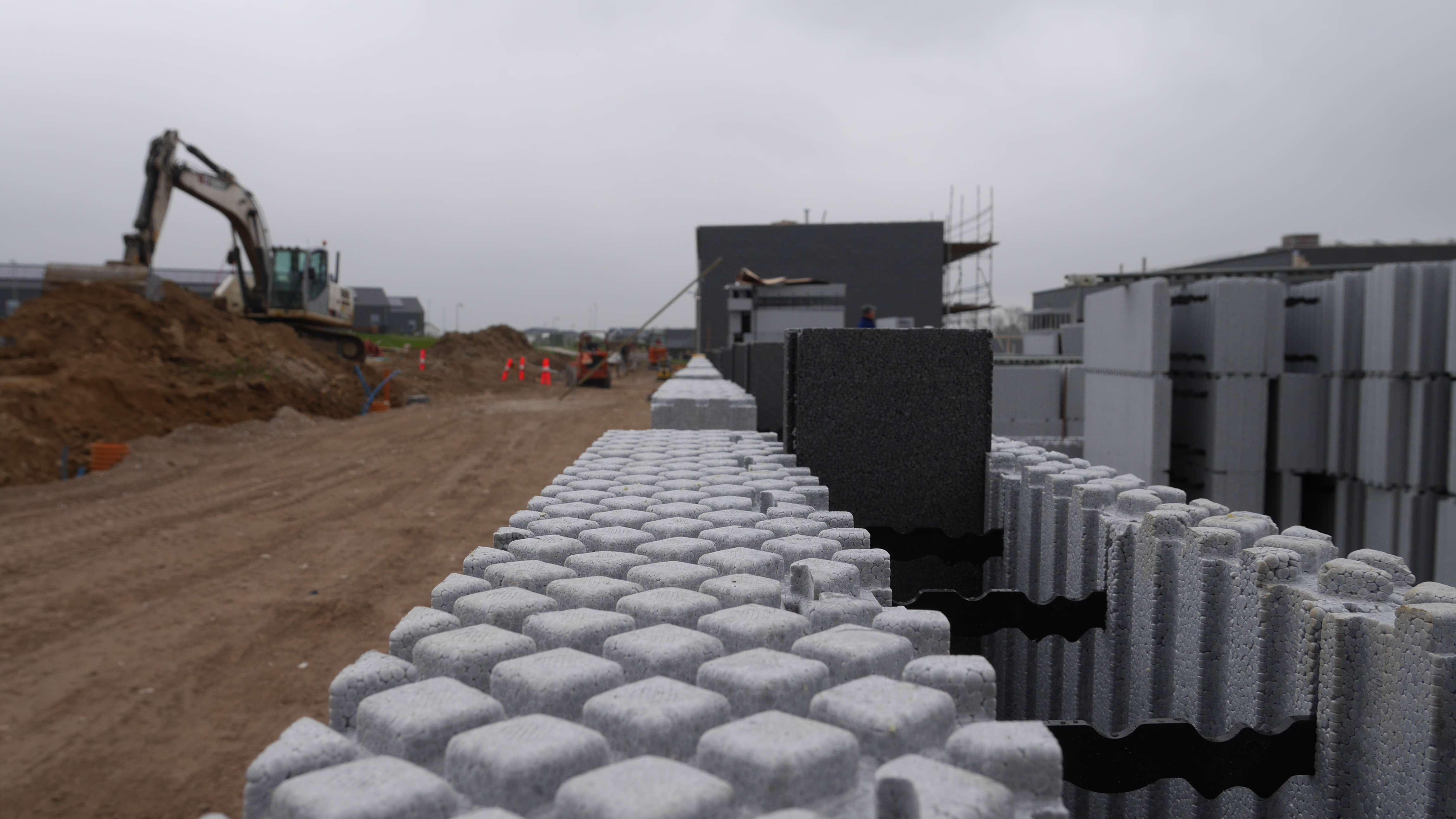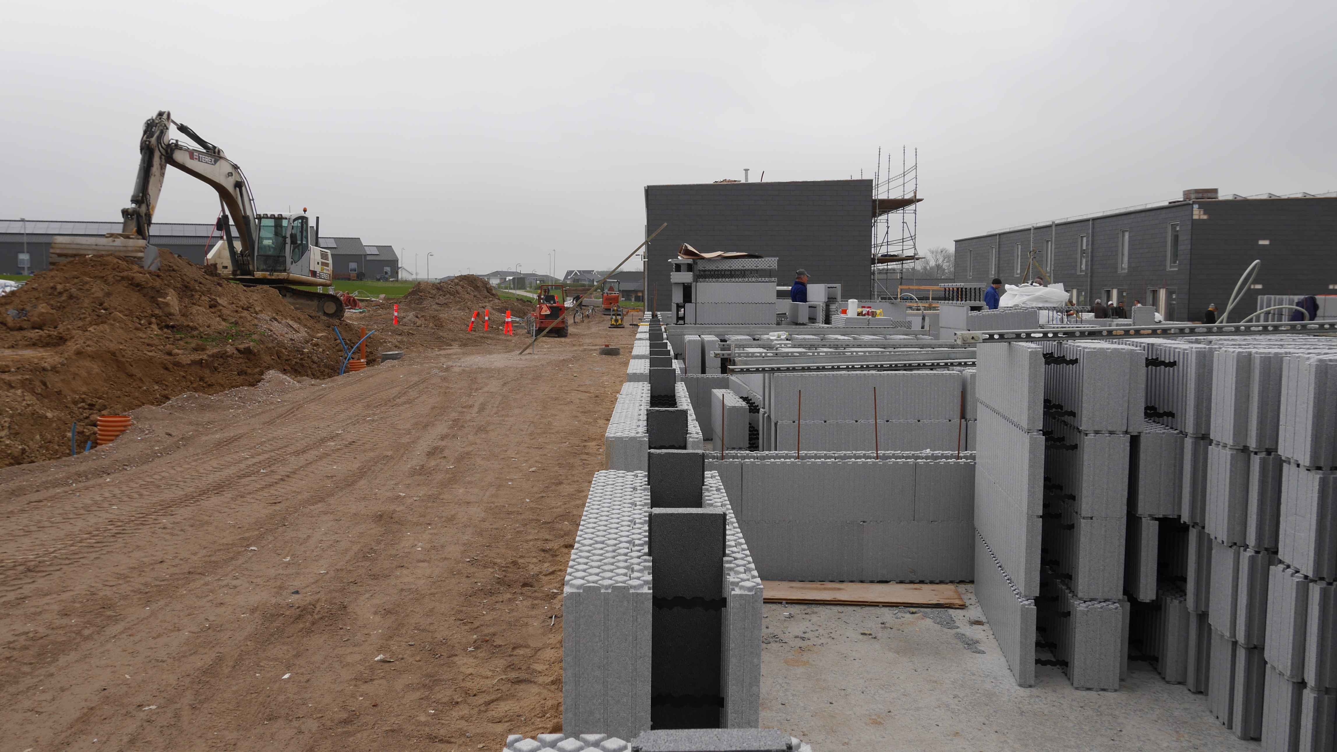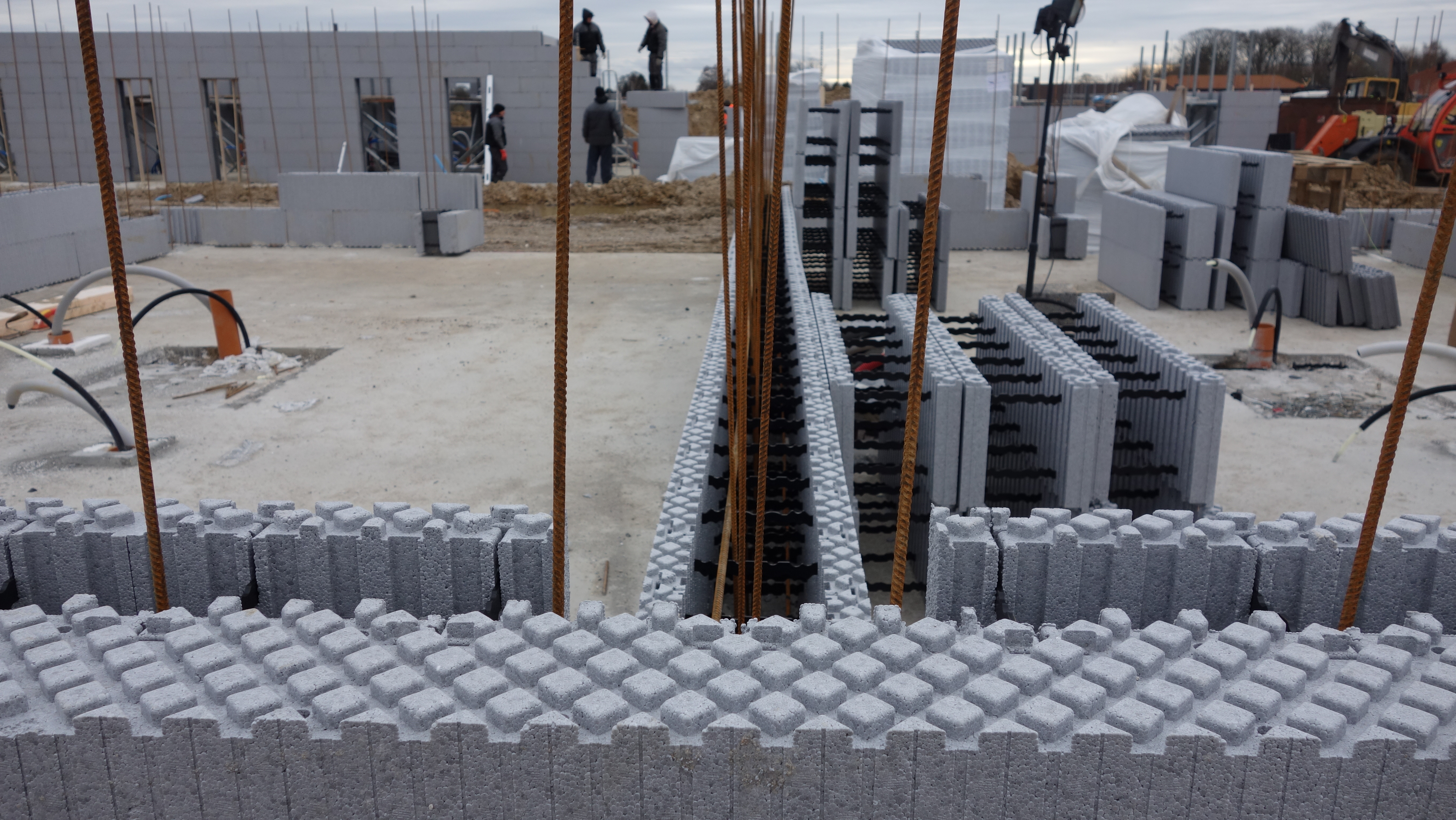 - Rækkehusene udnytter ISOBYG fleksibilitet, hvor der i ydervæggene er brugt 14 cm. beton, i skillevæggene er der brugt 19 cm. pga lydkrav, og i søjlerne ved terasseophæng er der brugt 24 cm. beton. Det fleksible system gør det nemt at tilpasse betontykkelsen, der hvor det statiske krav gør tykkere beton nødvendig.